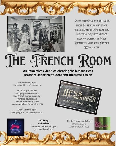 Join Jenny's Iconic Vintage and Soft Machine Gallery for "The French Room", a 3 day immersive exhibit celebrating Hess Brothers Department Store and Timeless Fashion.